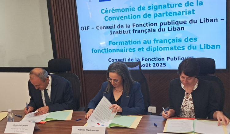 وقعت إتفاقية شراكة بين مجلس الخدمة المدنية والمنظمة الدولية للفرنكوفونية (OIF) والمعهد الفرنسي في لبنان (IFL)، بدعوة وحضور رئيسة المجلس نسرين مشموشي، من أجل التعاون وتعزيز قدرات الموارد البشرية في الإدارات العامة على استخدام اللغة الفرنسية المتخصصة في التواصل الشفهي والخطي، وإعداد وتنظيم التدريب ذي الصلة.