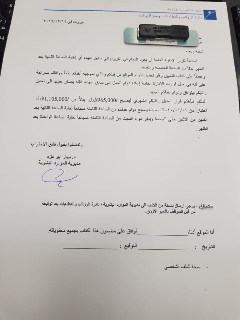 وبموجب هذه الورقة، يوافق الموظفون على قرار تعديل راتبهم الشهري ليصبح 965 ألف ليرة بدلاً من 1105000 ليرة، على أن يصبح دوام العمل من الساعة الثامنة حتى الساعة الثانية ظهراً، من دون أن يطرأ أي تعديل على دوام يوم السبت.