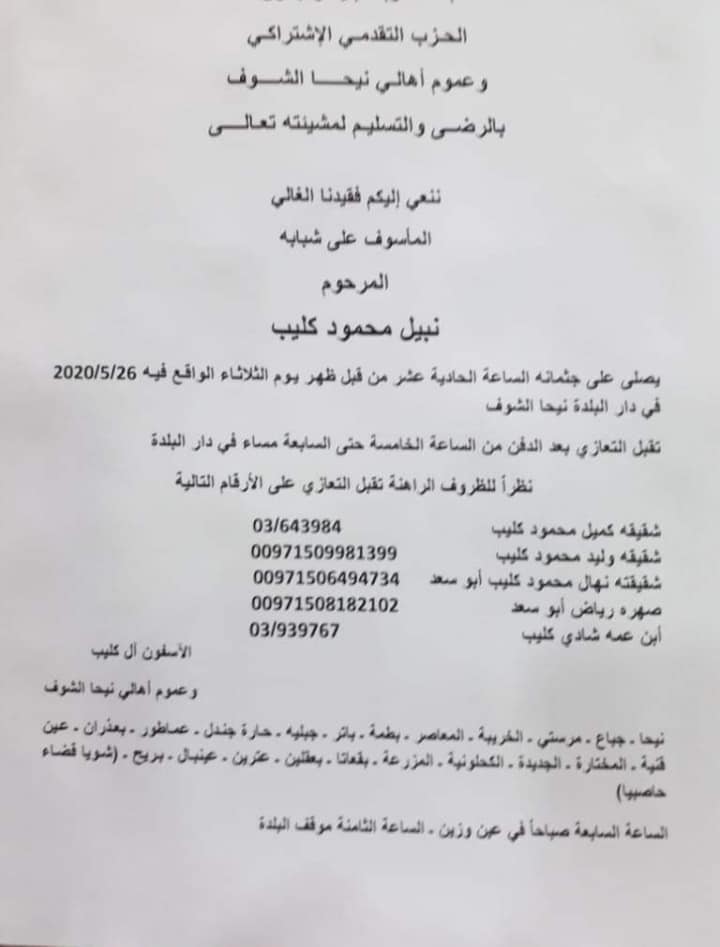 ذكرت معلومات صحافية أن جثمان نبيل محمود كليب، الذي قتل على يد طليقته من آل ضو، تم تشييعه اليوم في بلدته نيحا- الشوف في مأتم مهيب، وقد نعته عائلته و”​الحزب التقدمي الاشتراكي​” وعموم ابناء البلدة.