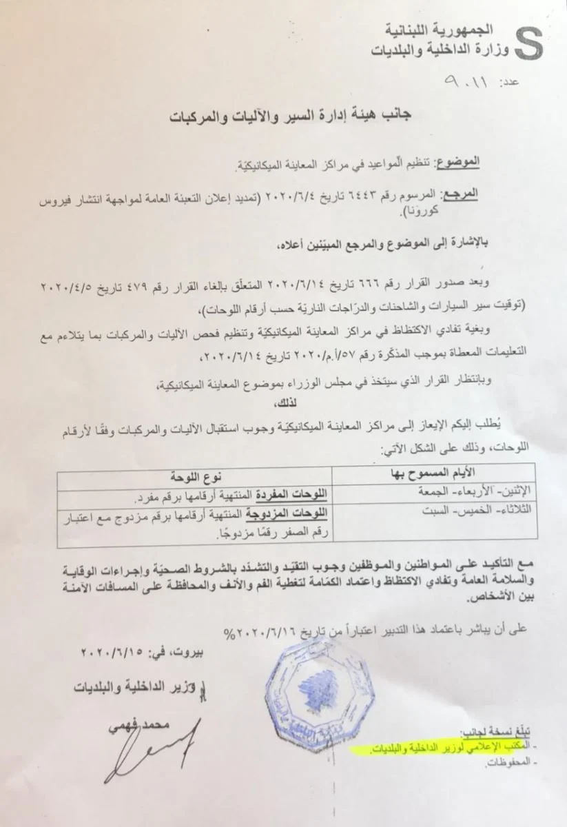 أصدر وزير الداخلية والبلديات العميد محمد فهمي مذكرة إلى هيئة إدارة السير والاليات والمركبات حول تنظيم المواعيد في مراكز المعاينة الميكانيكية، وذلك على الشكل التالي: