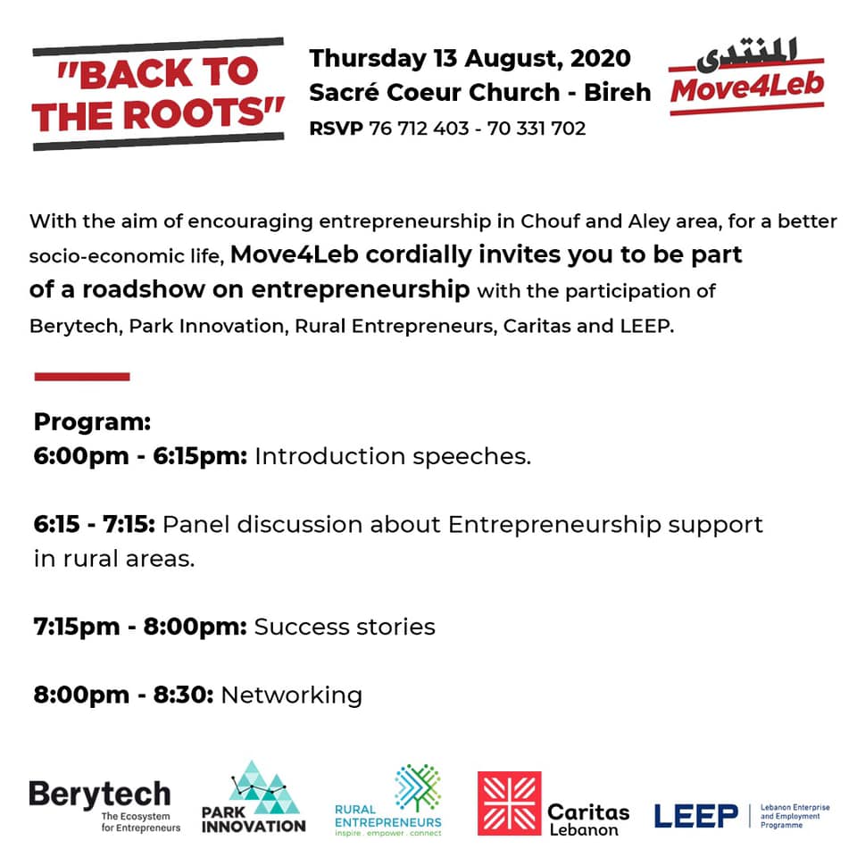 دعى منتدى “Move4Lebanon” وتحت شعار “Back To The Roots” إلى ندوة بعنوان “الطريق الى ريادة الأعمال” أو”Roadshow on Entrepreneurship”، بهدف تشجيع ريادة الأعمال في منطقتي الشوف وعاليه، وذلك يوم الخميس في 13 آب 2020 في كنيسة Sacre Coeur، في بلدة البيره الشوف.