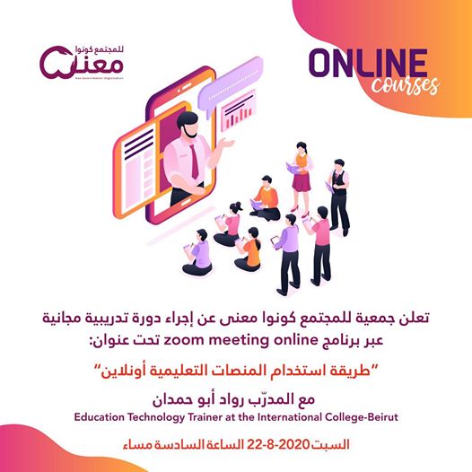 أعلنت جمعية “كونوا معنا” على صفحتها الرسمية في “موقع فيس بوك”، عن إجراء دورة تدريبية مجانية عبر برنامج zoom meeting online تحت عنوان طريقة استخدام المنصات التعليمية أونلاين.