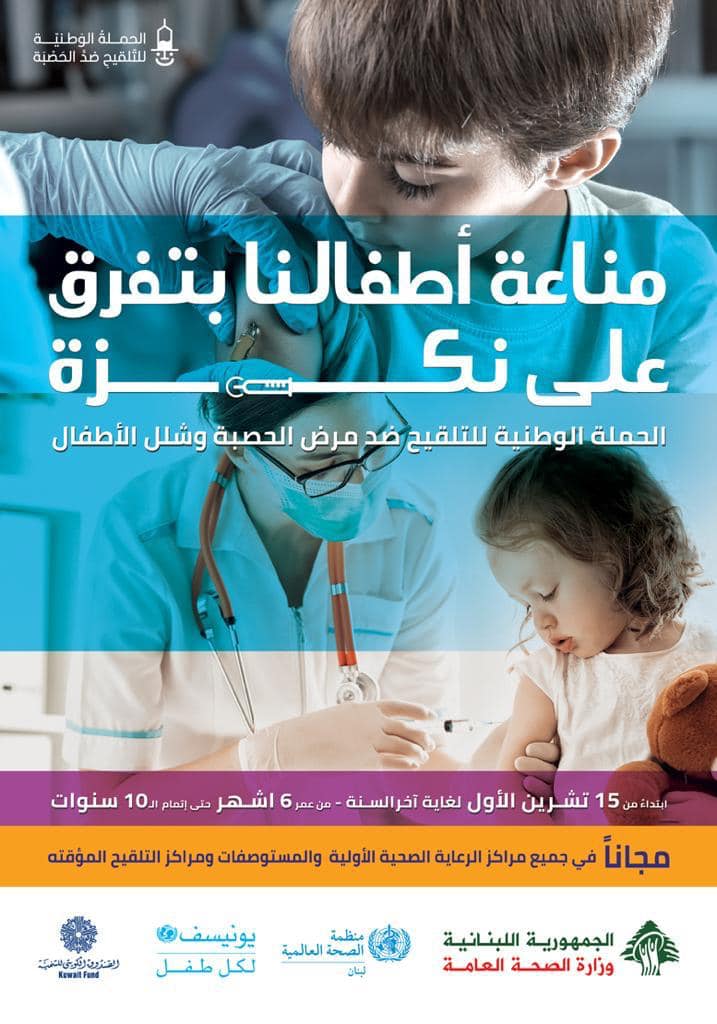 أعلنت وزارة الصحة بالتعاون مع منظمتي الصحة العالمية واليونيسيف عن الحملة المجّانية لتلقيح الأطفال من عمر ستّة أشهر وحتى العشر سنوات، من جميع الجنسيات ضدّ مرض الحصبة المتفشّي حاليًا، والوقاية من شلل الأطفال.