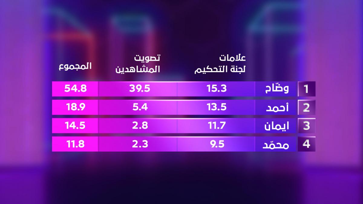 النتائج المفصلة للمشتركين الأربعة ، التي تبين كيف حصل وضاح على الفوز باللقب بجداره