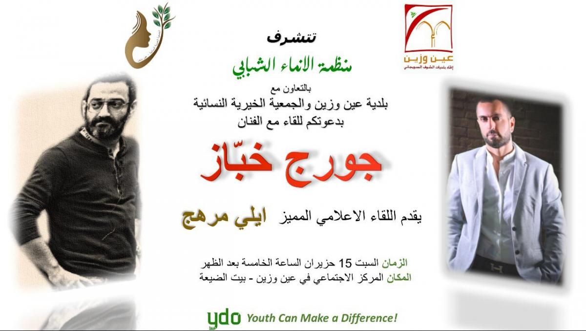 يلتقي الفنان المبدع جورج خباز محبّيه من أهالي الشوف يوم السبت 15 حزيران الساعة الخامسة بعد الظهر، في المركز الإجتماعي في عين وزين – بيت الضيعة.