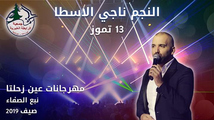 يحيي اليوم الفنان ناجي الأسطا الليلة الثانية من مهرجانات عين زحلتا – نبع الصفا صيف 2019، التي تقام في المدينة الكشفية في عين زحلتا، من تنظيم الرابطة الخيرية وبالتعاون مع بلدية عين زحلتا.